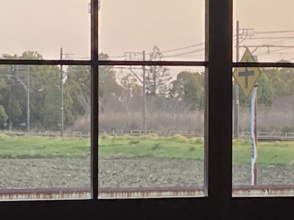 前の田んぼの畦道を何かが歩いて行く。