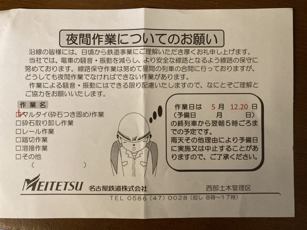 線路の夜間工事のチラシ。