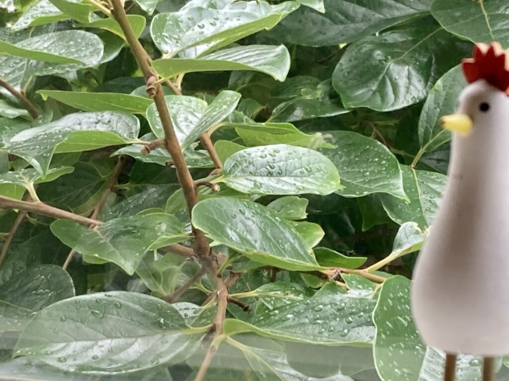 山田写真への道中、珈琲屋に寄り、手紙を書いた。その窓からの雨に濡れた柿の葉。