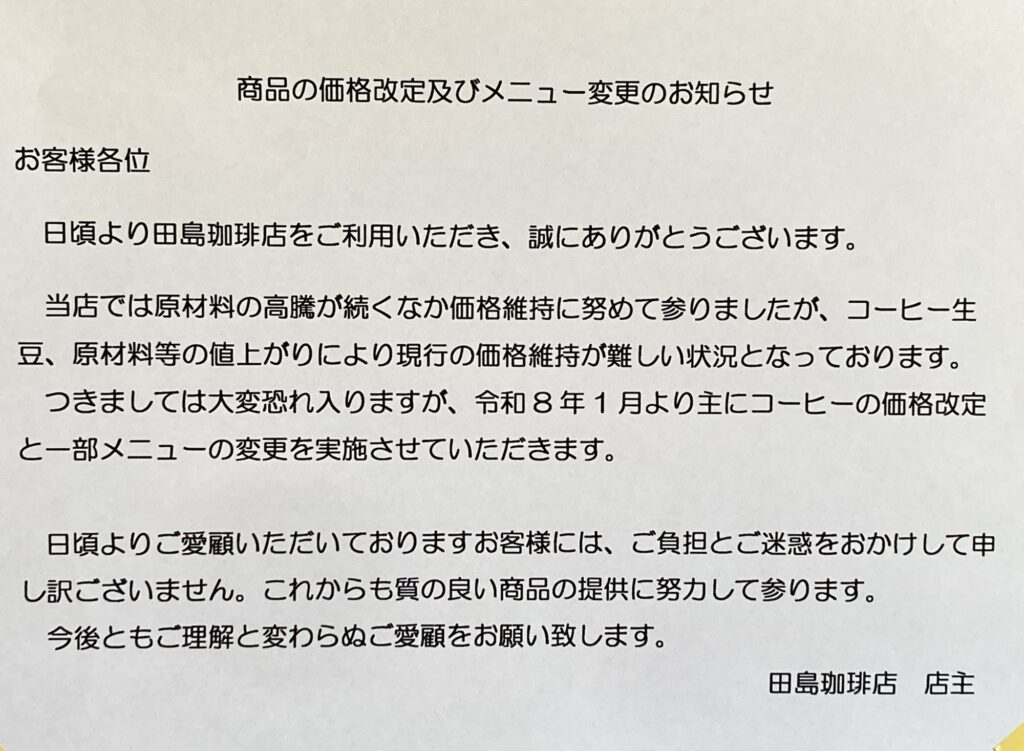 一月より、主にコーヒーに関して値上げの予定です。よろしくお願い致します。